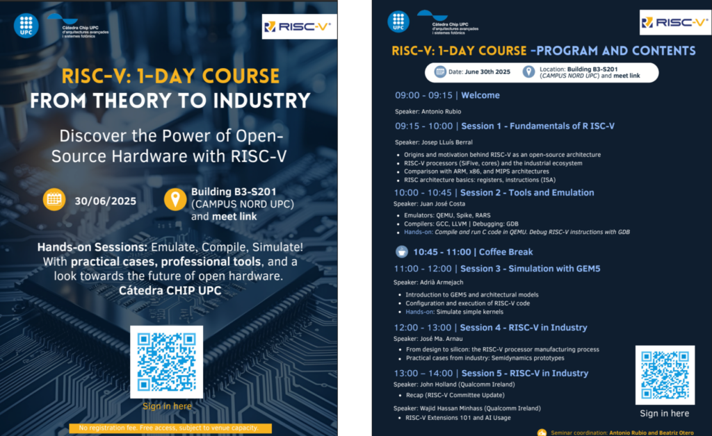 El passat 30 de juny de 2025, la Càtedra Chip UPC va dur a terme una jornada formativa d’alt impacte titulada “RISC-V: From Theory to Industry”, amb l’objectiu de capacitar estudiants i professionals en l’ecosistema del maquinari de codi obert.